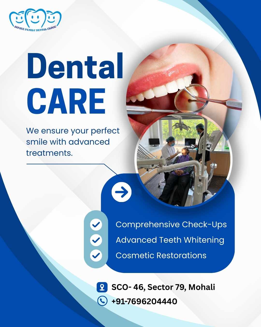 Japjee Family Dental Clinic is a modern dental clinic in Mohali offering complete oral care for all age groups. Patients can visit for dental implants, braces, root canal treatment, teeth whitening, and routine checkups. The clinic focuses on hygiene, comfort, and clear consultation before treatment. People searching for a reliable dentist in mohali or the best dentist in chandigarh can find suitable solutions here with updated techniques and simple procedures. Convenient location in Mohali makes it easy for nearby residents to access care without long travel. Each treatment plan is explained properly to help patients make informed decisions about their dental health.